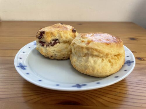 手前がプレーンスコーン、奥がクランベリーホワイトチョコのスコーンです。
